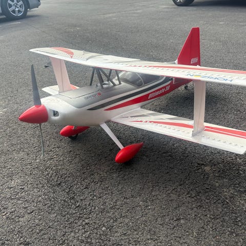 Det er innmontert mottaker med gyro og det følger med en brukt ok sender Spektrum DS6 i ferdig oppsatt. I tillegg følger det med koffert for sender og med lader og batteri 11volt 1300 mah og tester for batteri.