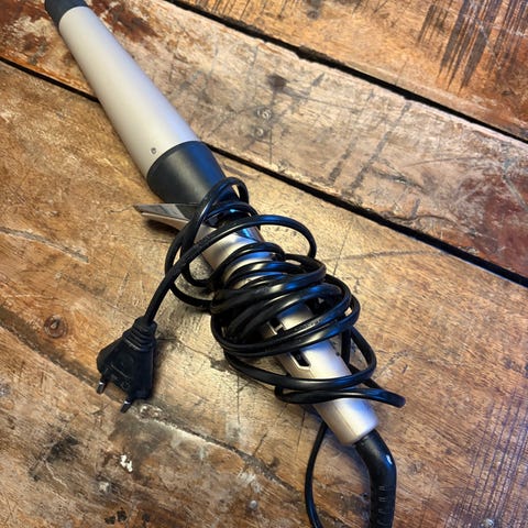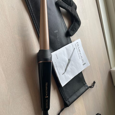 Remington krølltang med justerbar varme 130-210 grader. Blir varm fort og gir store, fine krøller. Har et plastfelt på tuppen slik at man kan holde i enden uten å brenne fingrene.