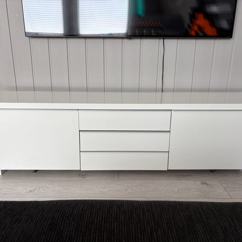 Fin og praktisk TV-benk med integrert stativ for å henge opp TV. Dette gir et stilrent, «svevende» inntrykk. I tillegg er det smarte løsninger for å samle og skjule kabler bak benken slik at disse ikke synes.