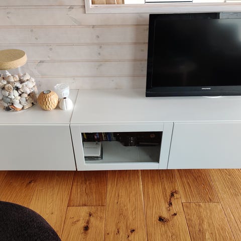 - Hentes delvis demontert (tv-stativ og skapdører skrudd av, skuff og hyller tatt ut)