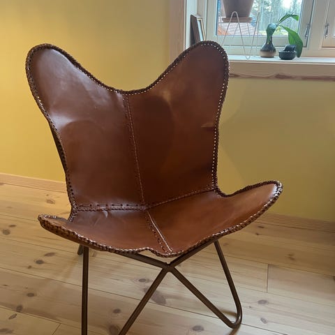 Dette er en kopi av flaggermusstolen. Den er konjakkfarget med sorte stolben. Den er i god stand. Det er ikke en IKEA-stol, men FINN lar meg ikke velge «ukjent». 😊