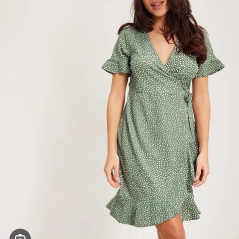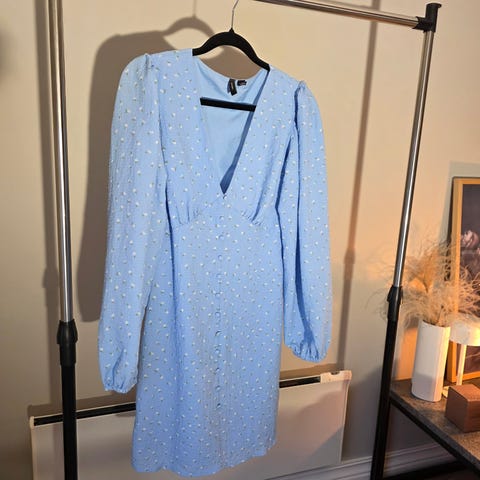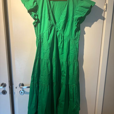 Vero Moda sommerkjole i grønn farge for dame. Kjolen er i størrelse XS. Modellen har v-utringning, korte volang-ermer og et lett, vidt skjørt med flere søm-partier som gir fall. Lengden går omtrent til leggen, avhengig av høyde.