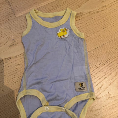 Janus body i str. 60-70. Langermet naturhvit (offwhite) modell i 100 % merinoull. Unisex passform som passer både gutter og jenter. Bodyen har noen svakere flekker, men ingen som er veldig tydelige (sånn som den ved halsen). Se bilder.