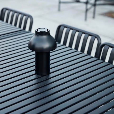 HAY Palissade hagebord i grønnlakkert metall., oliven farge. Bordet har et rektangulært bordplatefelt med langsgående metallribber og rette ben i samme materiale. Designet er laget for utendørs bruk, for eksempel på terrasse, balkong eller i hage. Bordet kan kombineres med stoler og benker i samme serie for en helhetlig sittegruppe.