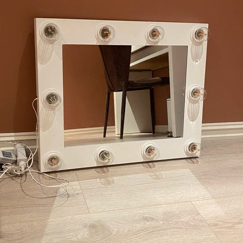 Speilet går på både batteri og strøm og har muligheter til å henges opp eller stå med støtte som vist på bildene.