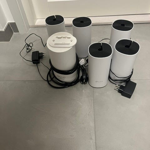 TP-Link Deco router mesh-system i hvit farge. Består av flere enheter som sammen gir trådløst nettverk i hjemmet. Hver enhet har nettverksporter på baksiden for kablet tilkobling av utstyr. Strømadaptere og nettverkskabel følger med på bildene. Egnet for bruk som trådløst hjemmenettverk med dekning i flere rom eller etasjer.