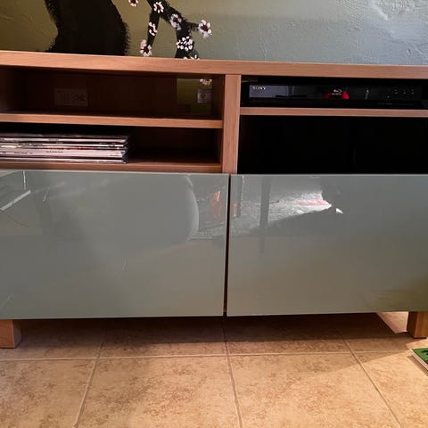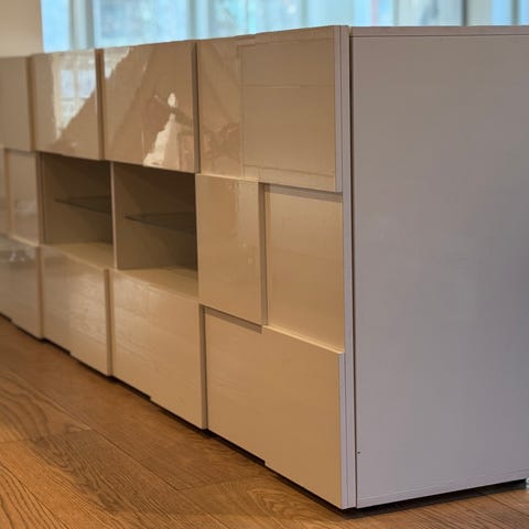 Selger to praktiske og stilrene IKEA Bestå-moduler i hvit utførelse. Skapene har et minimalistisk design som passer perfekt som TV-benk eller annen oppbevaring.