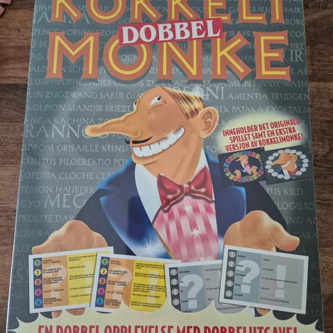 Kokkeli Monke Dobbel brettspill. Spillet er en dobbelutgave av Kokkeli Monke, med to spillvarianter i én eske. Inneholder spillebrett, kort, spillebrikker og tilbehør som brukes til ulike oppgaver og utfordringer i spillet. Passer som familiespill og til spillkvelder med flere deltakere.