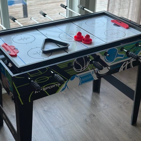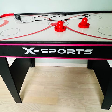 Barnet gir bort et Airhockey bord. Kjøpt brukt selv, kan derfor ikke si sikkert om dt funker som det skal, men har funket når vi har brukt det, også scoringenstelling har fungert. Gis bort til fordel for biljardbord hjemme😅 Ifølge xxl beskrivelsen: Stort elektronisk 48" Air-Hockey spill med kraftig vifte, stabilt understell, regulerbare ben, og elektronisk score display.