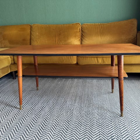 Selger vårt stuebord med magasin hylle under.