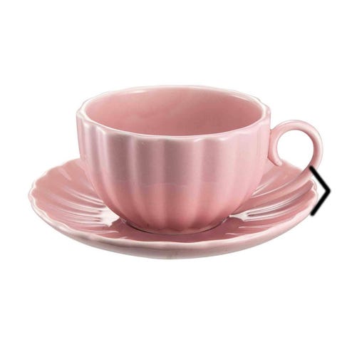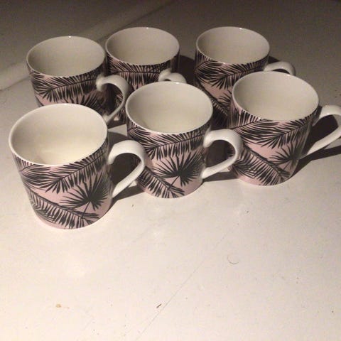 Fire krus i keramikk i to farger, med rosa glasert øvre del og beige nedre del. Krusene har sylinderform og kan stables..