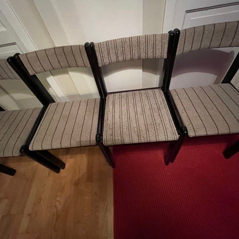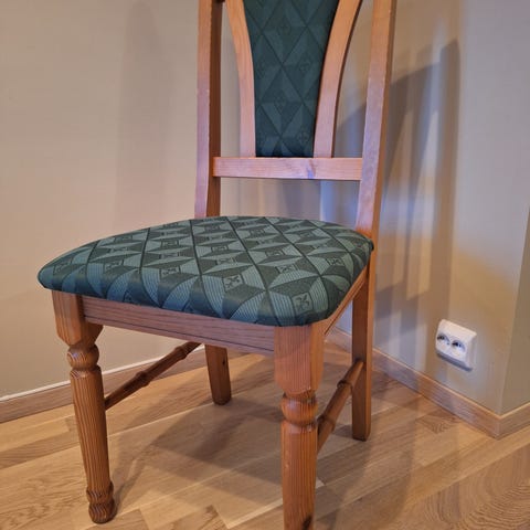 Seks stødige stoler gis bort (lakkerte, trolig i bjørk). Må hentes.