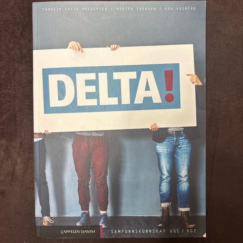 Cappelen Damm Delta! lærebok i samfunnsfag for VG1 og VG2, bokmål. Boken dekker kompetansemålene i samfunnskunnskap på videregående nivå og inneholder fagstoff, oppgaver og eksempler knyttet til demokrati, medborgerskap og samfunnsforhold. Egner seg som hovedbok i samfunnsfag for elever på VG1/VG2 i studieforberedende og yrkesfaglige utdanningsprogram.