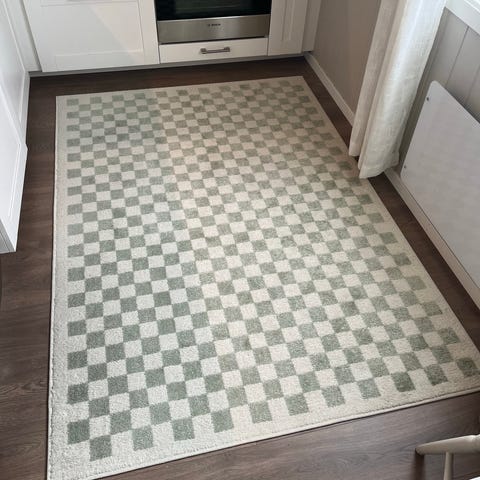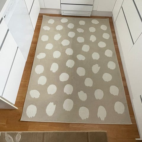 IKEA Bogense teppe i rektangulær form. Teppe i beige farge med hvite prikkete mønster.