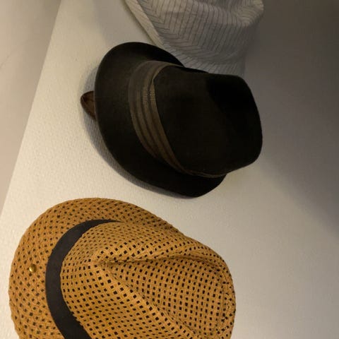 hatt i størrelse 58. Hatten er hvit og laget i lin. Modellen har klassisk form med brem og mørkt bånd rundt kronen. Passer til bruk i sol og varme dager, og kan kombineres med både hverdagsklær og mer pyntede antrekk.