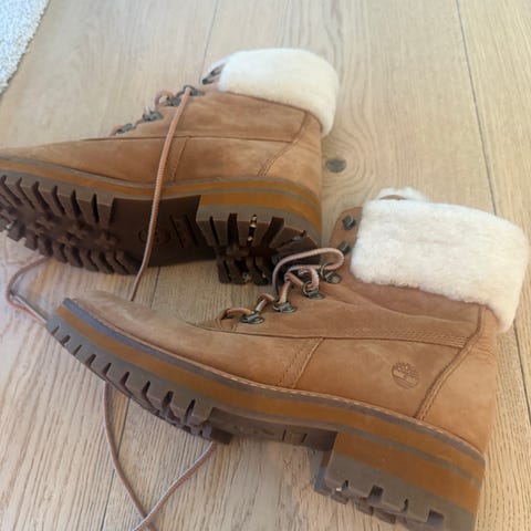 Timberland vinterstøvler i størrelse 41. Støvlene er laget i brunt semsket skinn med mykt, fôret innside for ekstra varme. Grovmønstret yttersåle gir godt grep på glatt underlag. Klassisk Timberland-logo på siden. Passer til bruk på kalde dager og i vintervær.