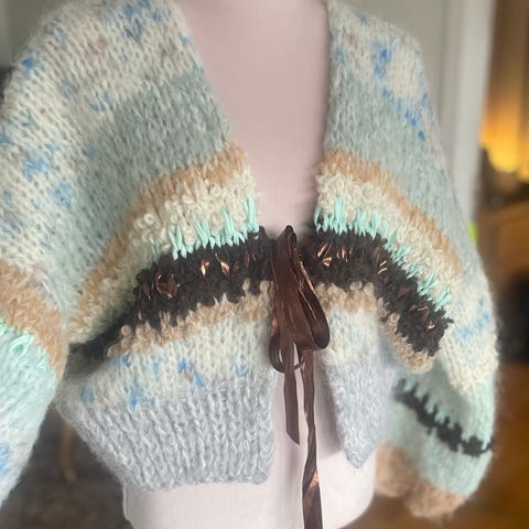 Misha strikkejakke. Ferdigstrikk kjøpt hos strikkemekka i 2025.