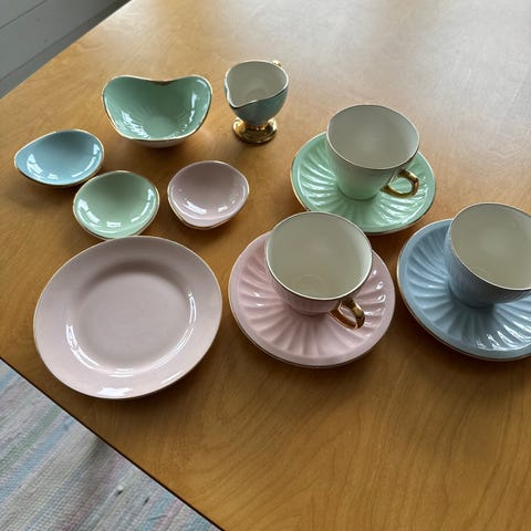 Skålesett i porselen i pastellfarger. Settet består av én større skål og seks mindre skåler i ulike pastellfarger, blant annet grønn, rosa, blå og gul. Skålene har organisk, bølget form med skjellinspirert struktur og gulldetaljer langs kanten. Egner seg til servering av snacks, småretter eller som dekorative skåler i hjemmet.