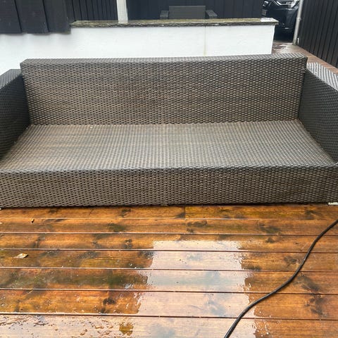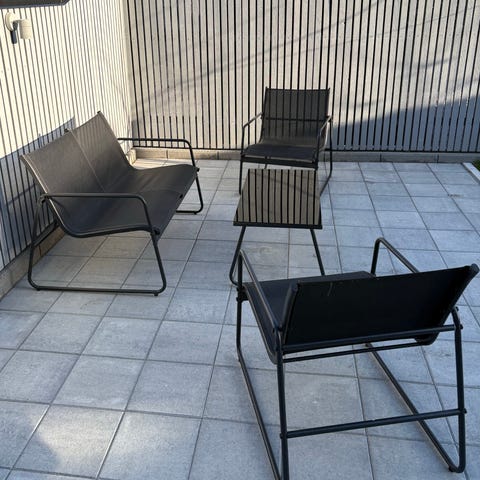 Reservert: Hagesett sofa, stol og bord grå med lyse puter