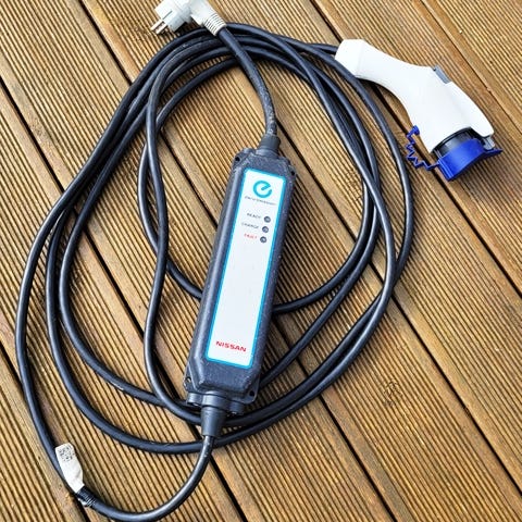 Ladekabel for vanlig stikkontakt til bl.a Outlander PHEV. Velger riktig ampere automatisk etter kapasitet. Selges da bilen jeg brukte den på, er solgt.