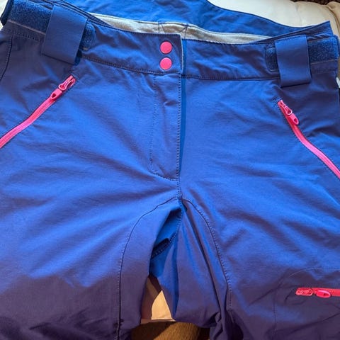 Skogstad turbukse for dame i størrelse L. Buksen er i blå nylon med forsterkede partier i mørkere blå. Den har flere lommer med glidelås foran og på siden, samt beltehemper i livet. Passer til tur og annet friluftsbruk der det er behov for lett og funksjonelt ytterplagg.