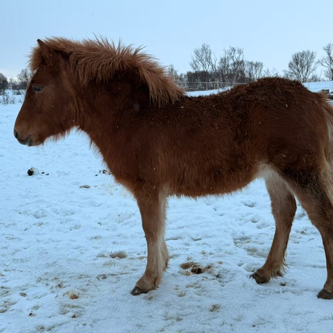 Stor, høyreist ponni med godt anlegg for å bli bruksponni. Blir godt over 100cm, er 90cm nå som åring. Laidback og svært sosial type. Uvanlig farge som skiller seg ut i mengden!