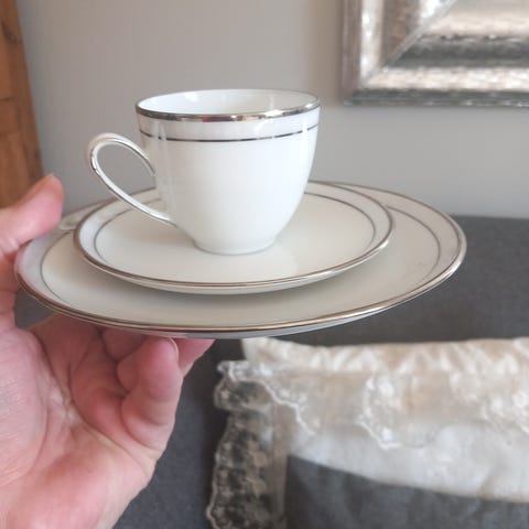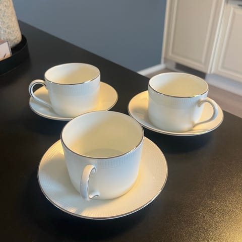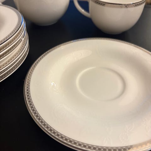 Selger fire kaffekopper med skåler i porselen. Følger med også en liten mugg til melk og en liten sukkerskål. Brukte bare et par ganger.