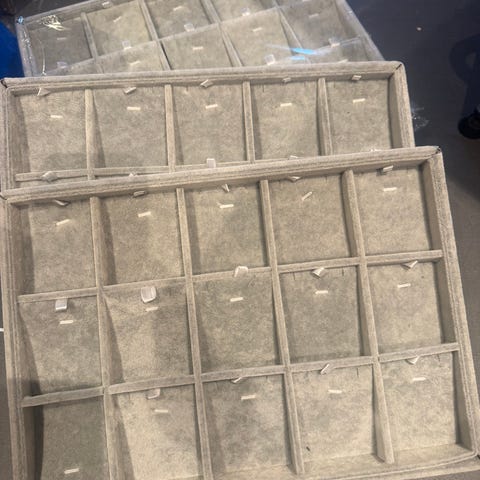 Klokkeinnlegg med flere rom og separate puter i grått tekstil. Hvert rom har en myk pute som egner seg til oppbevaring og organisering av armbåndsur eller smykker i en skuff eller eske. Innlegget er flatt og tilpasset bruk i skuffer eller skrin, og gir oversiktlig og skånsom lagring av innholdet.