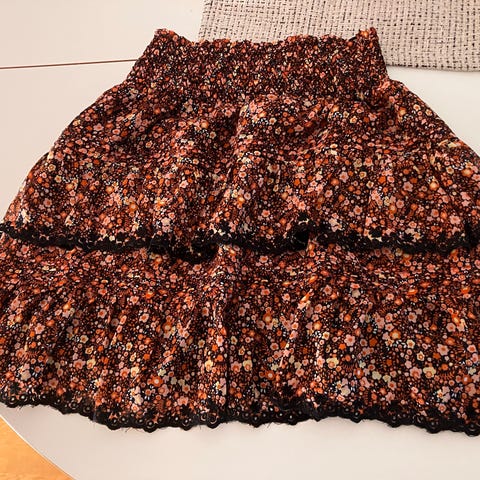 Skjørtet er laget i polyester og har et småblomstret trykk i flere farger.