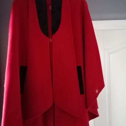 Selger en kåpe i en nydelig rødfarge. Du kan ha den med en åpen knapp for en type look eller kneppe den helt opp for en helt annen type look. Den er str 40 men vil si den er litt liten i str. jeg er normalt str 36/38 og denne ble akkurat litt stor for meg
