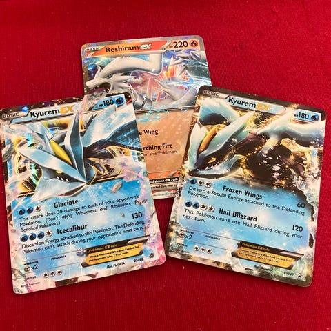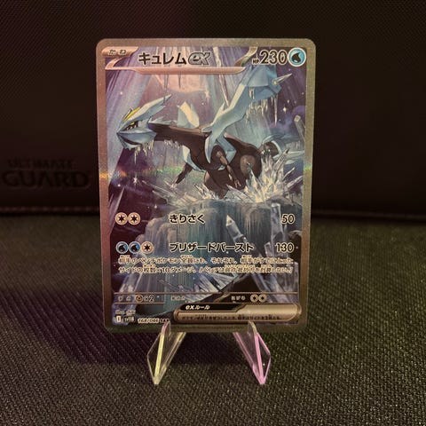 Pokémon Kyurem EX samlekort i holo-versjon. Kortet viser Kyurem EX med 180 HP og angrepene Glaciate og Frost Spear (tekst på engelsk). Standard Pokémon TCG-spillkortstørrelse. Egnet til samling eller bruk i Pokémon Trading Card Game-dekk.