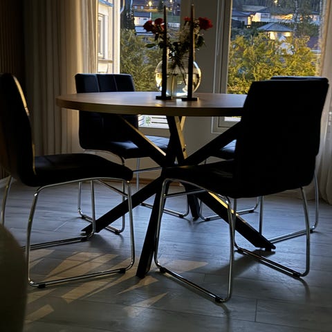 Rundt spisebord med rund glassplate og svart understell i kryssformet design. Bordplaten er i klart glass, og understellet består av flere skråstilte ben som gir god stabilitet. Egnet som spisebord eller møtebord i kjøkken, stue eller spisestue. Hbo 900,-