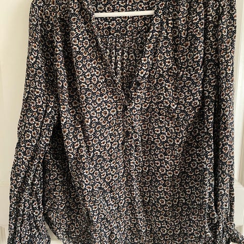 Fargerik bluse fra Sunco. Fremstår som ny. Kun prøvd på. Blusen har brede mansjetter på ermene og det er med et løst belte som f.eks kan bruks som sløyfe i halsen. Hel lende bak er 67 cm. Mål ua til ua er 65 cm x 2. Den har et rundt bærestykke med fine rynker rundt hele. Tungt fint stoff som faller fint. Røyk- og dyrefritt hjem.