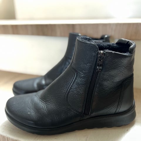 Italiensk skinnstøvler i størrelse 38. Støvlene er i svart skinn med spiss tå og lav, bred hæl. Skaftet har utskårne detaljer som gir et mønstret uttrykk. Passer til bruk i hverdagen eller til mer pyntede antrekk. Egnet for deg som bruker skostørrelse 38 og ønsker klassiske svarte skinnstøvler med dekorativt skaft.. Jeg kjøpte dem i Italia .