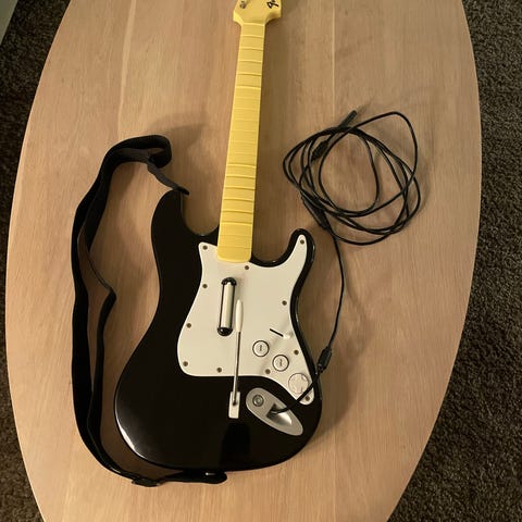 Kablet gitarformet kontroller i hvit plast med sort hals og fargede knapper på gripebrettet. Kontrolleren har retningsknapper, Xbox 360-knapp, strum bar, whammy bar og 1 stk skulderrem. Utformet for musikk- og rytmespill som støtter gitar kontroller på Xbox 360.