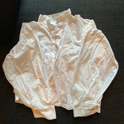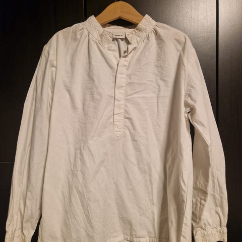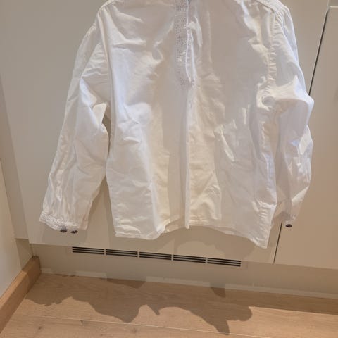 Pent brukt bunadskjorte i bomull. Brukt av ett barn i et røykfritt og dyrefritt hjem. Oppbevart tørt i et garderobeskap. Ingen skader eller flekker.