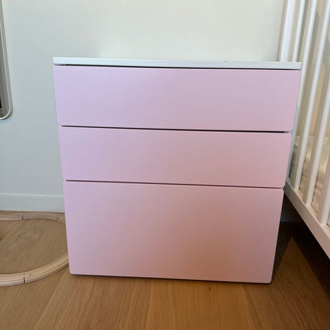 Hjemmelaget oppbevaringskasse til barnerom i rosa fargetoner. Kassen har lokk som kan åpnes oppover og hengsler på innsiden. Nederst er det en åpen hylle for ekstra oppbevaring. Egnet til oppbevaring av leker, klær eller annet utstyr på barnerom. Laget i tre med malt overflate. Høyde 60cm, 45 bred og 38cm lang.