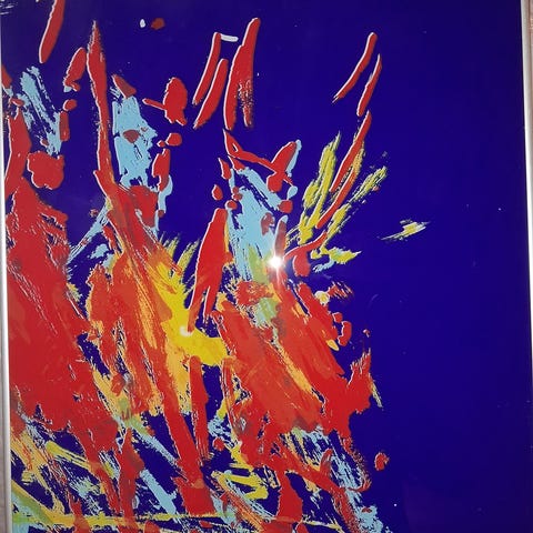 Maleri med figurativt motiv i blå og gule toner. Bildet viser flere stiliserte menneskefigurer i lyse pastellfarger. Maleriet er innrammet i en enkel, lys ramme. Egner seg som veggdekor i stue, gang eller andre oppholdsrom.