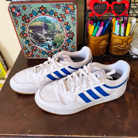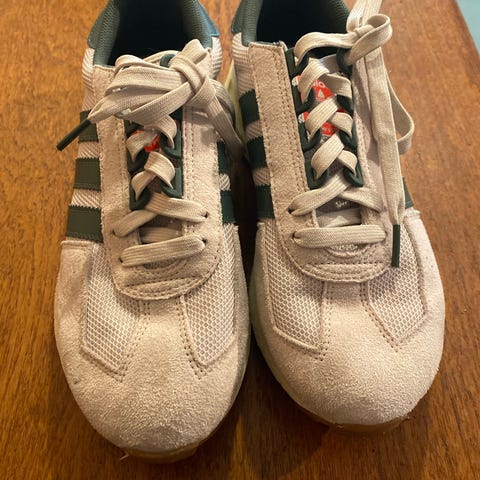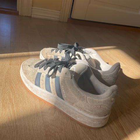 Adidas sneakers i størrelse 41. Skoene har overdel i lys blå/hvit tone med blå Adidas-striper på siden og lys blå lisser. Yttersålen er i gummi med brun/oransje farge. Modellen er en klassisk joggesko/sneaker som passer til hverdagsbruk og lett fritidsaktivitet. Laget i tekstil og syntetiske materialer med polstret hæl og pløse for økt komfort. Sålen har mønster som gir godt grep på underlaget.
