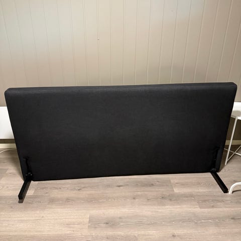 Sengegavl i beige stoff til 180 cm bred seng. Noen merker i stoffet, men det er helt og uten skade. Monterings sett følger med, har aldri vært montert.