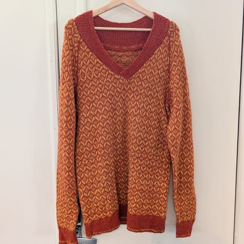 Genseren er strikket i Vikinggarn Sportsragg. 60% ull, 20% nylon og 20% akryl og Superwash 100% ull. Tykk og god genser. Farge grønn og natur. Overvidde 114cm, hel lengde 69 cm og ermelengde 47cm. Salgspris 900.