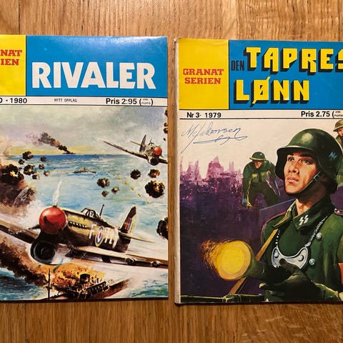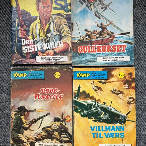 Kamp-serien tegneseriehefter med krigstema i samling. Hefteforsidene viser motiver fra andre verdenskrig med soldater, fly, skip og stridsvogner. Serien består av små tegneseriehefter i farger med enkeltstående historier i hvert hefte. Egner seg for lesere som er interessert i krigshistorie i tegneserieformat og for samlere av eldre norske tegneserier. Antall hefter og enkelttitler fremgår av bildene.