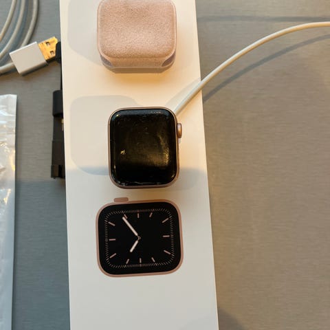 Apple Watch smartklokke med rektangulær skjerm og rosa silikonrem. Klokken har pulssensor på baksiden og justerbar rem med flere hull for tilpasning til håndleddet. Passer til bruk i hverdagen for varsler, aktivitetsmåling og tidsvisning sammen med kompatibel iPhone-enhet.