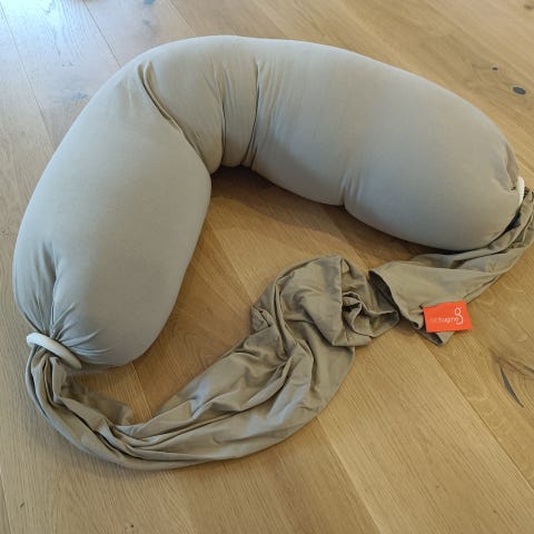 bbhugme gravidpute i lys grønn farge. Putens form og fyll gir støtte til kropp og mage under graviditet, og kan også brukes som støttepute ved amming eller avslapning. Trekket kan tas av for vask, og puten kan knytes eller justeres etter ønsket fasong og støtte. Oppbevaringspose følger med.