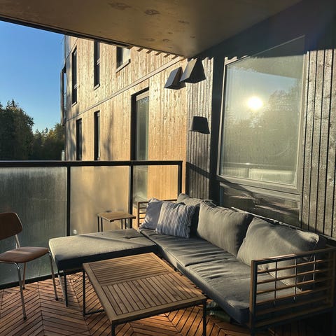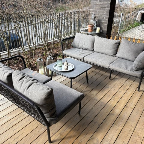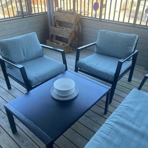 Modulær hagegruppe i hardplast i lysegrønn farge. Gruppen består av flere sittemoduler med rygg og armlener, samt lave bord som kan brukes som sidebord eller krakker. Møblene har spiler i sete og rygg, og rette, enkle linjer som gir et moderne uttrykk. Egnet for bruk på balkong, terrasse eller i hage. Materialet er hardplast som er tilpasset utendørs bruk. Kjøpt i 2025, føler det er for stort her. Sofa er 120cm bred og stolene 60 cm. Jeg kjøpte dette for 9990.- nytt, selges for 2500.- med puter