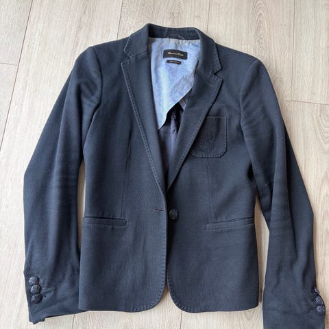 Massimo Dutti blazer i størrelse 38. Jakken er svart og laget i ullstoff med glatt fòr på innsiden. Klassisk fasong med krage og slag, knappelukking foran og lommer i front. Egnet til bruk både til jobb, hverdag og mer formelle anledninger.