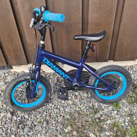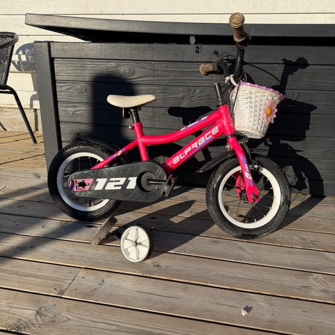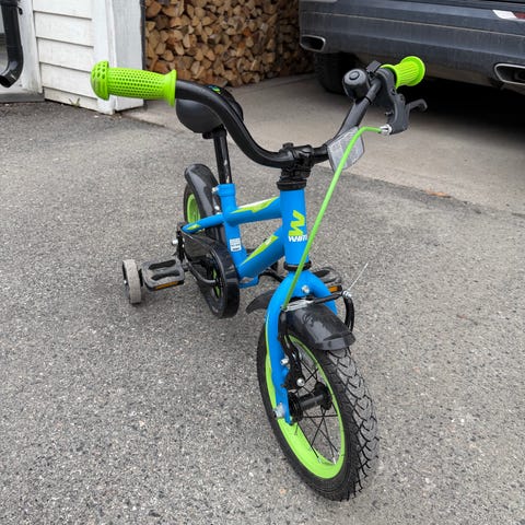 Nakamura Wildcat barnesykkel 12". Den er utstyrt med støttehjul, styrestang for voksen, ringeklokke og kurv foran. Håndtakene har dekorbånd. Egnet som første sykkel for barn som lærer å sykle, med ekstra støtte og enkel manøvrering.