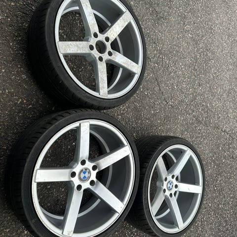 Div bruksmerker og sår finnes, men ellers tøffe felger som kler BMW og Transporter bra, mulig de passer flere modeller, sjekk bilder for innpress osv.
