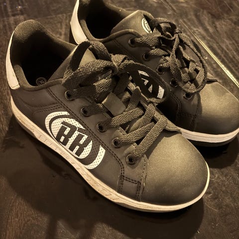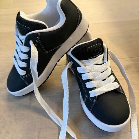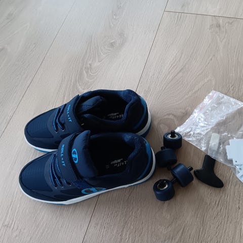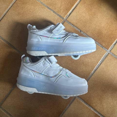 Disse skoene er superkule, de har form som en vanlig joggesko/sneaker og funker som det, men du har også muligheten til å flippe av en del av sålen og erstatte den med et robust hjul for å rulle på hælen. Det gjelder begge skoene.