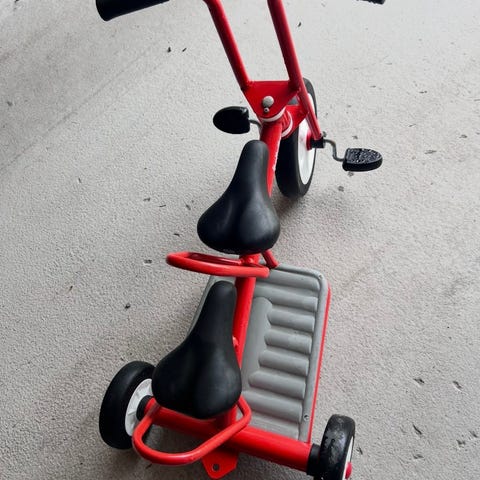 Trehjulssykkel for barn med 10" hjul. Sykkelen har rød ramme og svarte detaljer som sete, pedaler og håndtak. Utstyrt med tre hjul for stabilitet. Egnet for små barn som skal øve på tråkking og balanse på en enkel sykkelmodell.